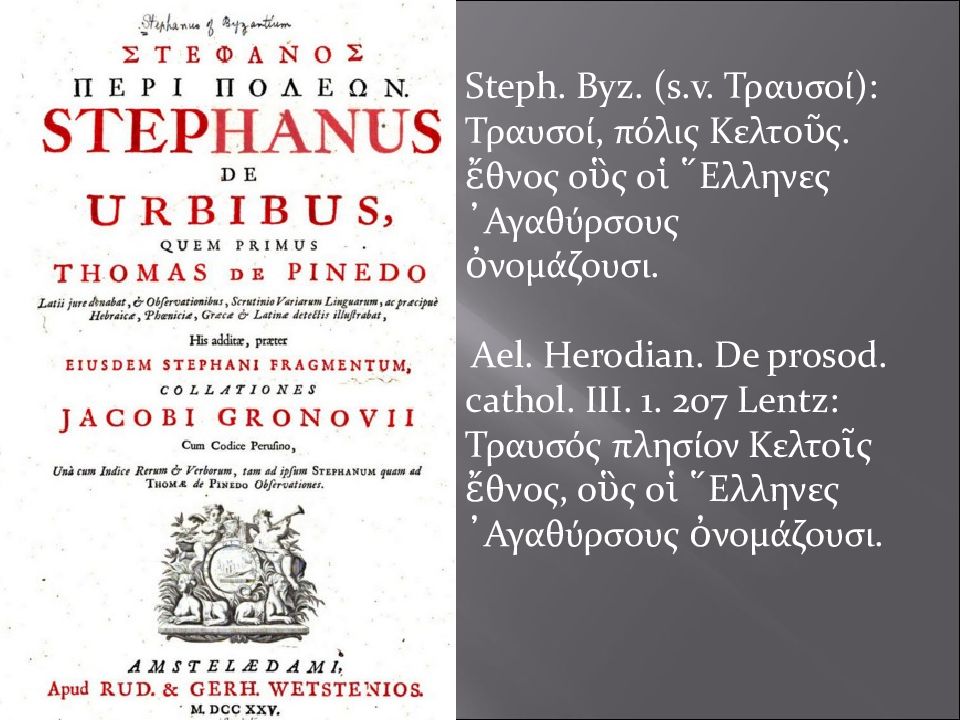 Steph. Byz. (s.v. Τραυσοί ): Τραυσοί, πόλις Κελτοῦς. ἔθνος οὓς οἱ ῞Ελληνες ᾿Αγαθύρσους ὀνομάζουσι. Ael. Herodian. De prosod. cathol. III. 1. 207 Lentz: Τραυσός πλησίον Κελτοῖς ἔθνος, οὓς οἱ ῞Ελληνες ᾿Αγαθύρσους ὀνομάζουσι.