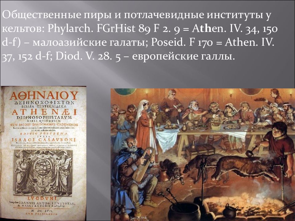 Общественные пиры и потлачевидные институты у кельтов : Phylarch. FGrHist 89 F 2. 9 = A th en. IV. 34, 150 d‑f ) – малоазийские галаты ; Pos e id. F 170 = Athen. IV. 37, 152 d-f; Diod. V. 28. 5 – европейские галлы.