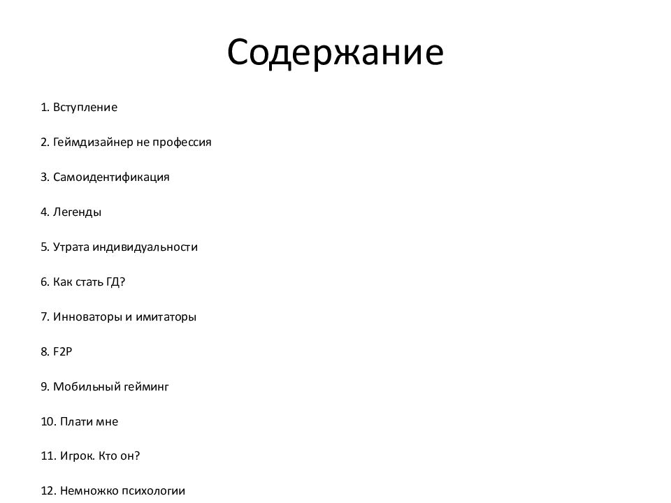 1. Вступление 2. Геймдизайнер не профессия 3. Самоидентификация 4. Легенды 5. Утрата индивидуальности 6. Как стать ГД? 7. Инноваторы и имитаторы 8. F2P 9. Мобильный гейминг 10. Плати мне 11. Игрок. Кто он? 12. Немножко психологии