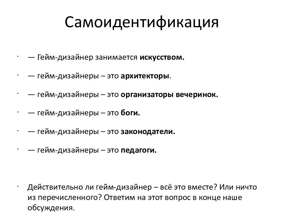 — Гейм-дизайнер занимается искусством. — гейм-дизайнеры – это архитекторы. — гейм-дизайнеры – это организаторы вечеринок. — гейм-дизайнеры – это боги. — гейм-дизайнеры – это законодатели. — гейм-дизайнеры – это педагоги. Действительно ли гейм-дизайнер – всё это вместе? Или ничто из перечисленного? Ответим на этот вопрос в конце наше обсуждения. Самоидентификация
