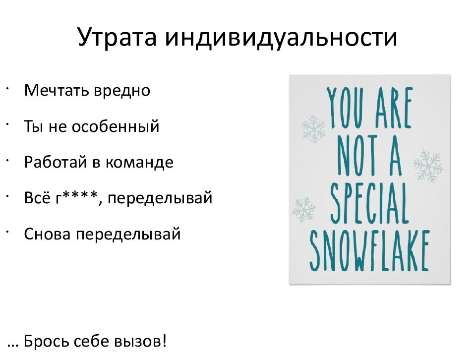 Мечтать вредно Ты не особенный Работай в команде Всё г****, переделывай Снова переделывай … Брось себе вызов!