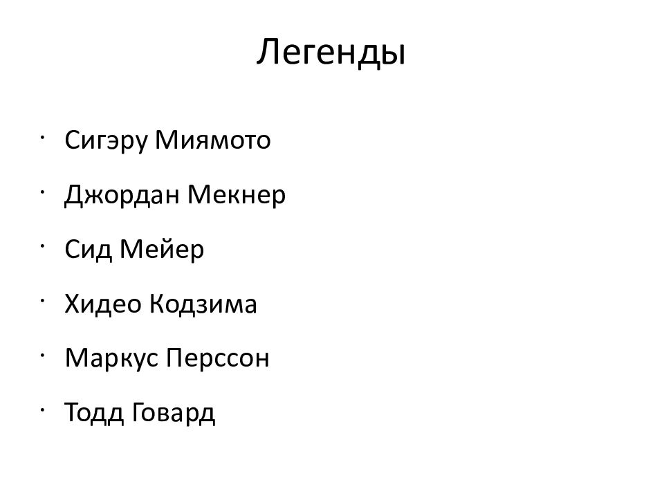 Сигэру Миямото Джордан Мекнер Сид Мейер Хидео Кодзима Маркус Перссон Тодд Говард