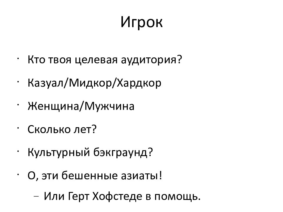 Кто твоя целевая аудитория? Казуал/Мидкор/Хардкор Женщина/Мужчина Сколько лет? Культурный бэкграунд? О, эти бешенные азиаты! Или Герт Хофстеде в помощь.