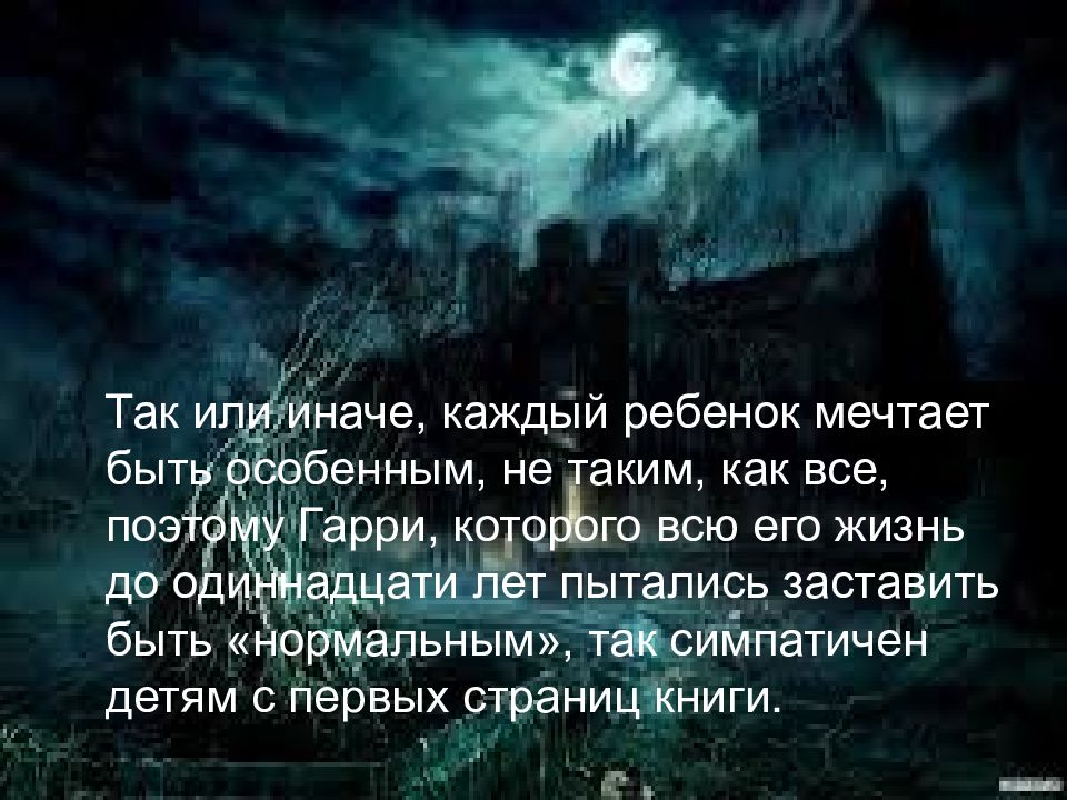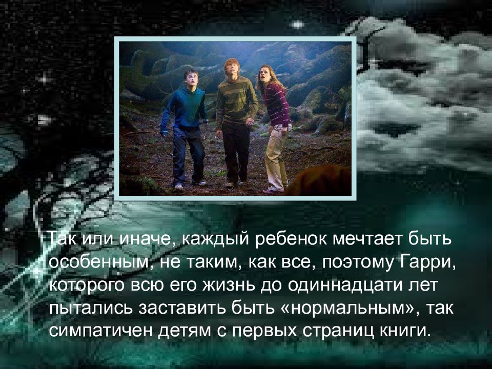 Так или иначе, каждый ребенок мечтает быть особенным, не таким, как все, поэтому Гарри, которого всю его жизнь до одиннадцати лет пытались заставить быть «нормальным», так симпатичен детям с первых страниц книги.