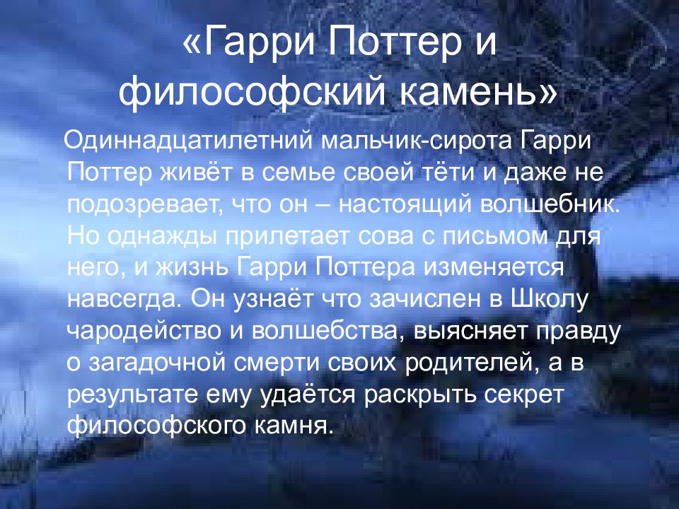 Часть истории теряется, когда книга становится фильмом. «Гарри Поттер и Философский камень» — первый том в серии книг про юного волшебника Гарри Поттера. Книга впервые была опубликована 30 июня 1997 года Лондонским издательством «Блумсбери», и по её мотивам был снят одноимённый фильм. « Гарри Поттер и философский камень » — первая лента в серии фильмов о мальчике - волшебнике Гарри Поттере из книг Дж. К. Роулинг. Лента в прокате с 16 ноября 2001 года. Первыми её увидели в Англии и Америке.