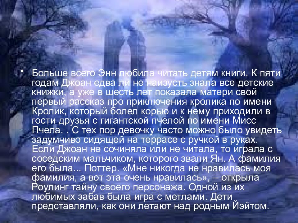 Больше всего Энн любила читать детям книги. К пяти годам Джоан едва ли не наизусть знала все детские книжки, а уже в шесть лет показала матери свой первый рассказ про приключения кролика по имени Кролик, который болел корью и к нему приходили в гости друзья с гигантской пчелой по имени Мисс Пчела.. С тех пор девочку часто можно было увидеть задумчиво сидящей на террасе с ручкой в руках. Если Джоан не сочиняла или не читала, то играла с соседским мальчиком, которого звали Ян. А фамилия его была... Поттер. «Мне никогда не нравилась моя фамилия, а вот эта очень нравилась», – открыла Роулинг тайну своего персонажа. Одной из их любимых забав была игра с метлами. Дети представляли, как они летают над родным Йэйтом.