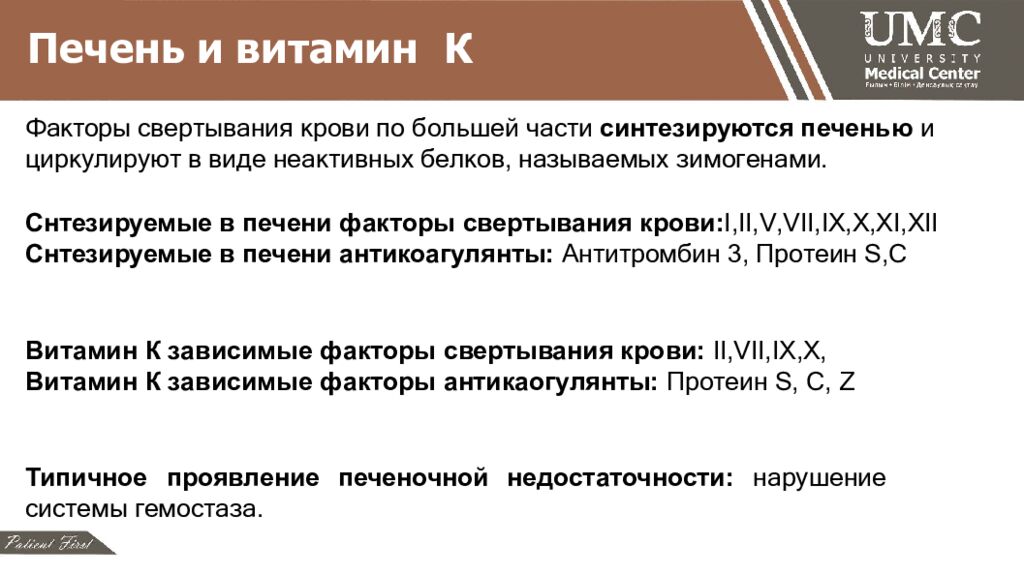 Факторы свертывания крови по большей части синтезируются печенью и циркулируют в виде неактивных белков, называемых зимогенами. Снтезируемые в печени факторы свертывания крови: I,II,V,VII,IX,X,XI,XII Снтезируемые в печени антикоагулянты: Антитромбин 3, Протеин S,C Витамин К зависимые факторы свертывания крови: II,VII,IX,X, Витамин К зависимые факторы антикаогулянты: Протеин S, C, Z Типичное проявление печеночной недостаточности: нарушение системы гемостаза.