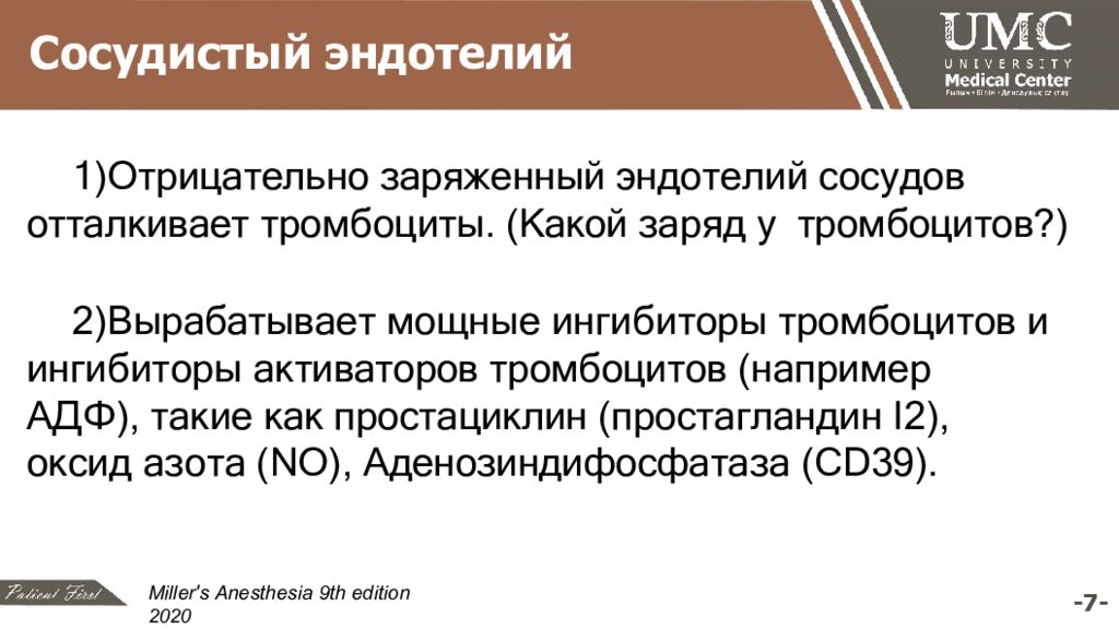 Miller's Anesthesia 9th edition 2020 - 7 - Отрицательно заряженный эндотелий сосудов отталкивает тромбоциты. (Какой заряд у тромбоцитов?) Вырабатывает мощные ингибиторы тромбоцитов и ингибиторы активаторов тромбоцитов (например АДФ), такие как простациклин (простагландин I2), оксид азота (NO), Аденозиндифосфатаза (CD39).