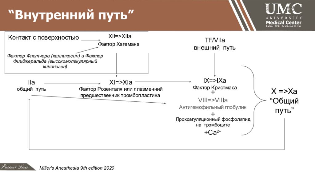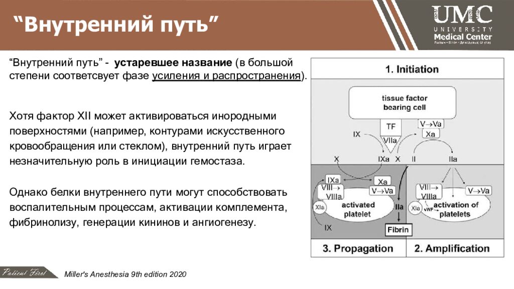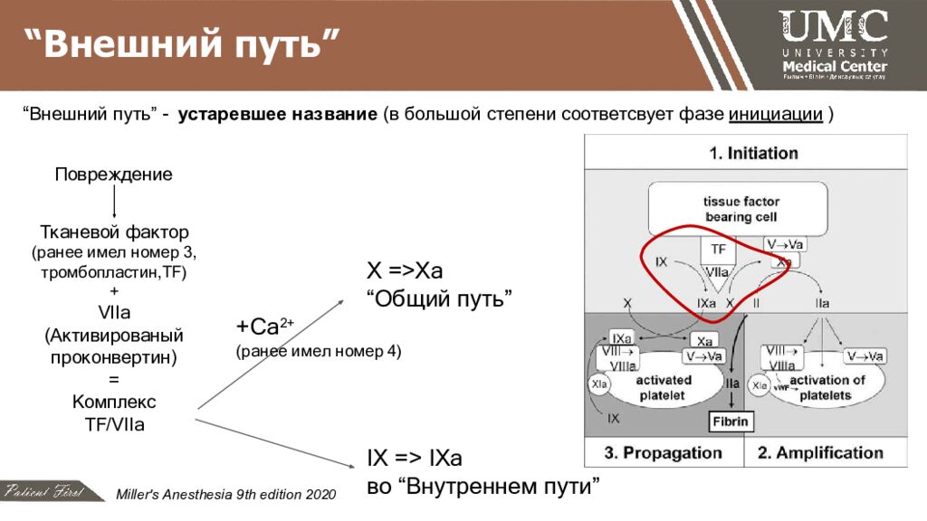 Тканевой фактор (ранее имел номер 3, тромбопластин,TF) + VIIa (Активированый проконвертин) = Комплекс ТF/VIIa “Внешний путь” - устаревшее название (в большой степени соответсвует фазе инициации ) Повреждение X =>Xa “Общий путь” +Сa 2+ (ранее имел номер 4) IX => IXa во “Внутреннем пути” Miller's Anesthesia 9th edition 2020