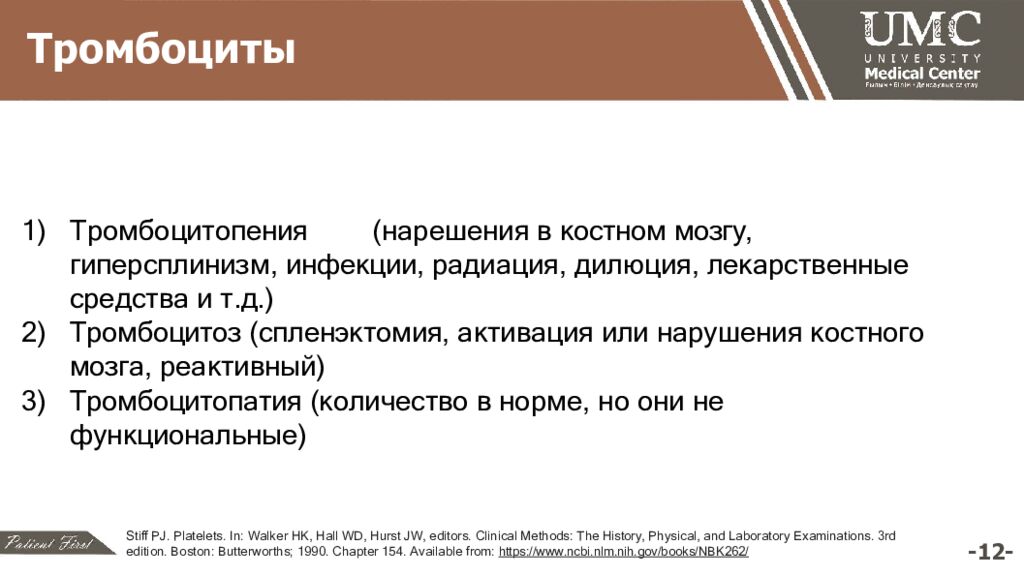 - 12- Тромбоциты Тромбоцитопения (нарешения в костном мозгу, гиперсплинизм, инфекции, радиация, дилюция, лекарственные средства и т.д.) Тромбоцитоз (спленэктомия, активация или нарушения костного мозга, реактивный) Тромбоцитопатия (количество в норме, но они не функциональные) Stiff PJ. Platelets. In: Walker HK, Hall WD, Hurst JW, editors. Clinical Methods: The History, Physical, and Laboratory Examinations. 3rd edition. Boston: Butterworths; 1990. Chapter 154. Available from: https://www.ncbi.nlm.nih.gov/books/NBK262/