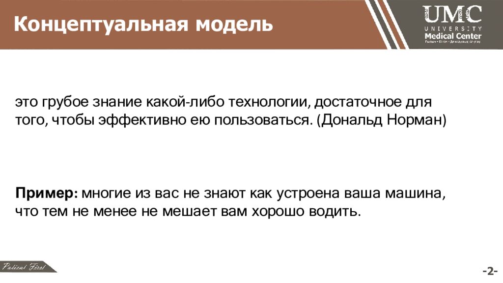 - 2- Концептуальная модель это грубое знание какой - либо технологии, достаточное для того, чтобы эффективно ею пользоваться. ( Дональд Норман ) Пример : многие из вас не знают как устроена ваша машина, что тем не менее не мешает вам хорошо водить.