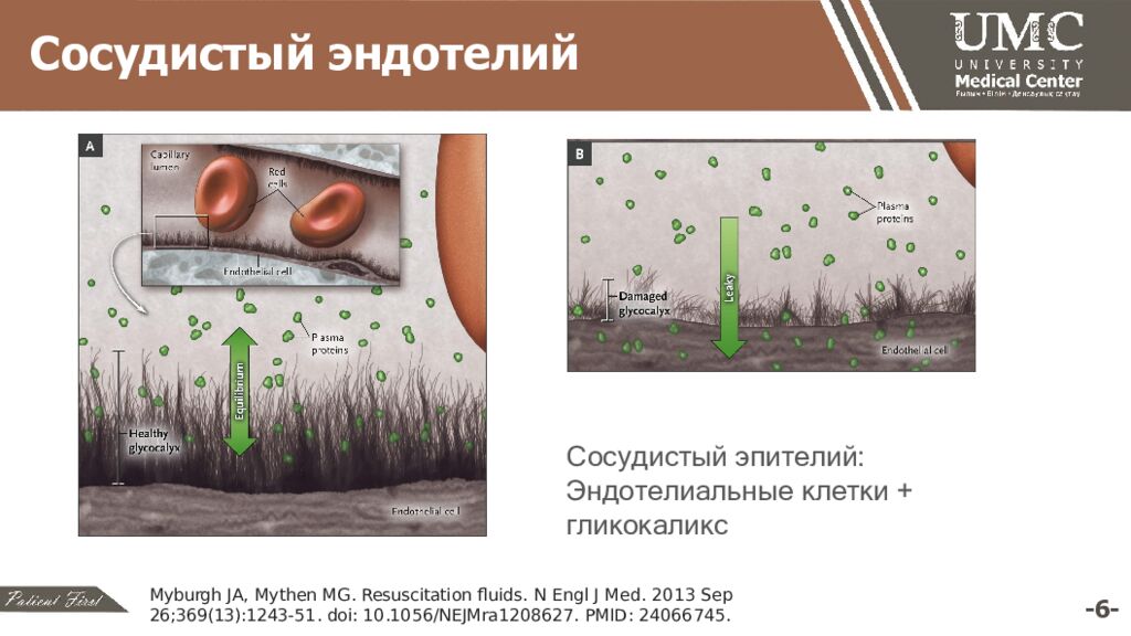 - 6- Сосудистый эндотелий Myburgh JA, Mythen MG. Resuscitation fluids. N Engl J Med. 2013 Sep 26;369(13):1243- 51. doi: 10.1056/NEJMra1208627. PMID: 24066745. Сосудистый эпителий: Эндотелиальные клетки + гликокаликс