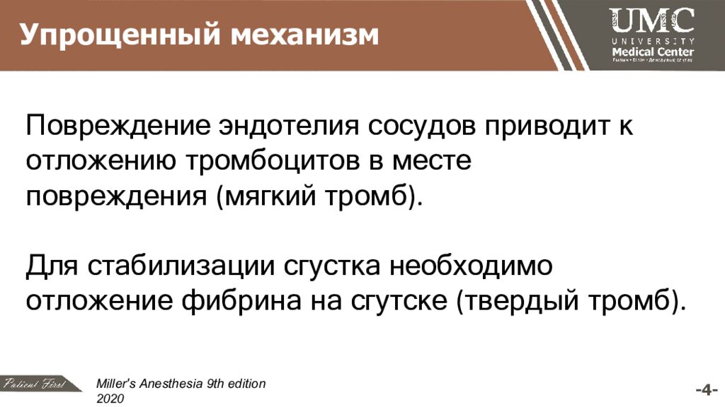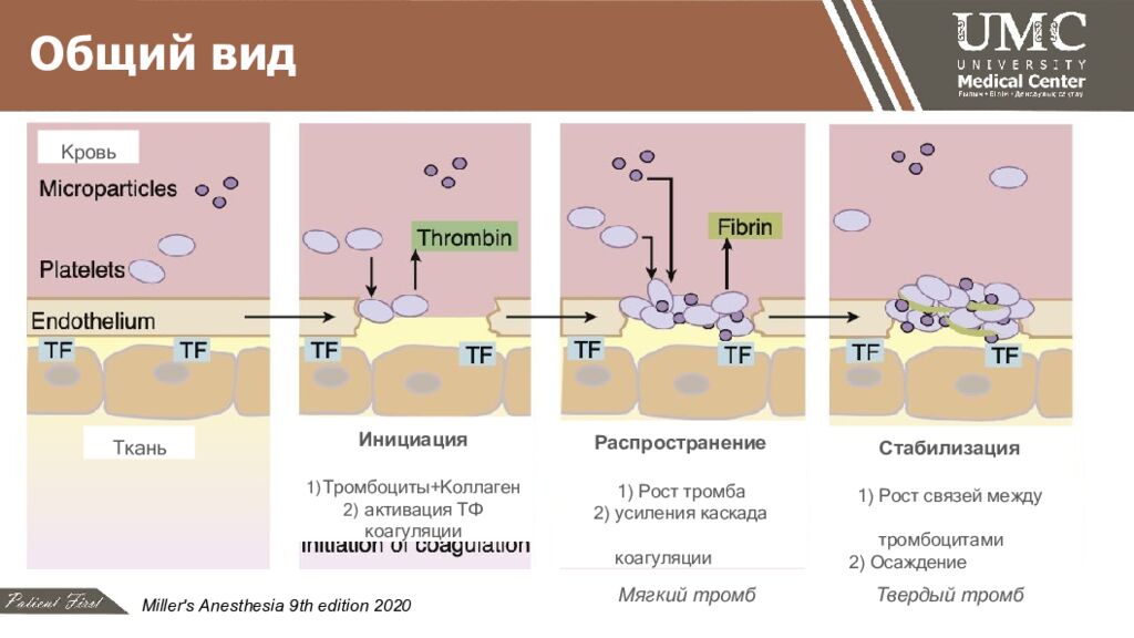 Miller's Anesthesia 9th edition 2020 Ткань Кровь Инициация Тромбоциты+Коллаген активация ТФ коагуляции Распространение Рост тромба усиления каскада коагуляции Cтабилизация Рост связей между тромбоцитами Осаждение фибрина Мягкий тромб Твердый тромб