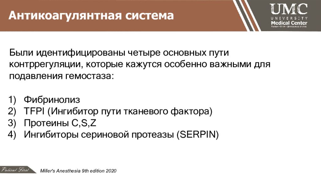 Miller's Anesthesia 9th edition 2020 Были идентифицированы четыре основных пути контррегуляции, которые кажутся особенно важными для подавления гемостаза: Фибринолиз TFPI (Ингибитор пути тканевого фактора) Протеины C,S,Z Ингибиторы сериновой протеазы (SERPIN)