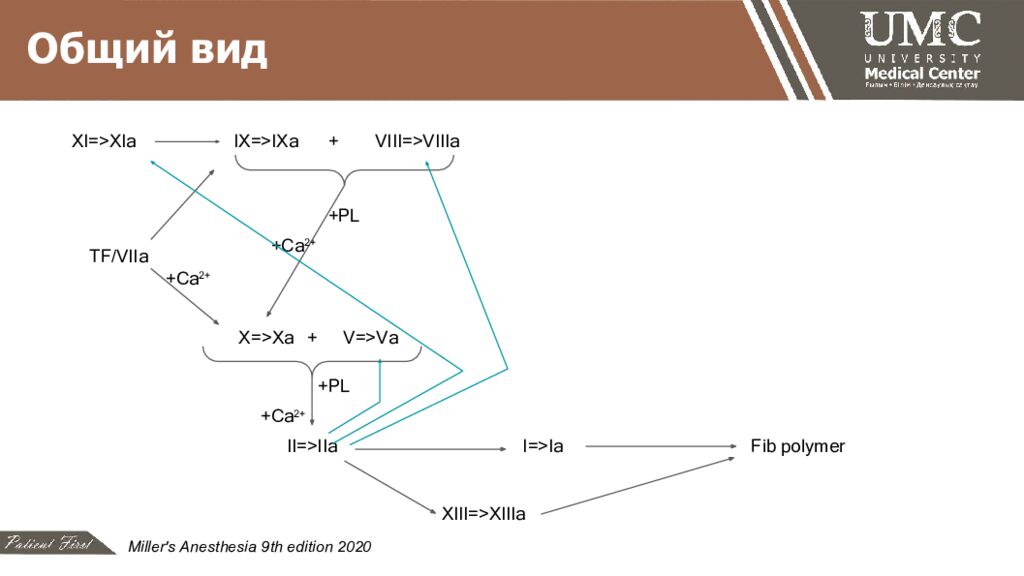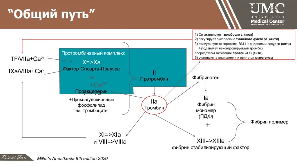 XI=>XIa Фактор Розенталя или плазменний предшественник тромбопластина IX=>IXa Фактор Кристмаса TF/VIIa внешний путь IIa общий путь + VIII=>VIIIa Антигемофильный глобулин X =>Xa “Общий путь” Контакт с поверхностью XII=>XIIa Фактор Хагемана Фактор Флетчера (калликреин) и Фактор Фицджеральда (высокомолекулярный кининоген) Прокоагуляционный фосфолипид на тромбоците +Сa 2+ + Miller's Anesthesia 9th edition 2020
