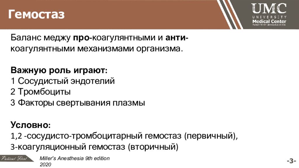 Miller's Anesthesia 9th edition 2020 - 3 - Баланс меджу про - коагулянтными и анти - коагулянтными механизмами организма. Важную роль играют : Сосудистый эндотелий Тромбоциты Факторы свертывания плазмы Условно : 1,2 - сосудисто - тромбоцитарный гемостаз ( первичный ), 3- коагуляционный гемостаз ( вторичный )