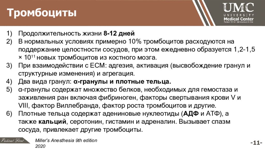 - 11- Тромбоциты Продолжительность жизни 8- 12 дней В нормальных условиях примерно 10% тромбоцитов расходуются на поддержание целостности сосудов, при этом ежедневно образуется 1,2–1,5 × 10 11 новых тромбоцитов из костного мозга. При взаимодействии с ECM: адгезия, активация (высвобождение гранул и структурные изменения) и агрегация. Два вида гранул: α- гранулы и плотные тельца. α- гранулы содержат множество белков, необходимых для гемостаза и заживления ран включая фибриноген, факторы свертывания крови V и VIII, фактор Виллебранда, фактор роста тромбоцитов и другие. Плотные тельца содержат адениновые нуклеотиды ( АДФ и АТФ), а также кальций, серотонин, гистамин и адреналин. Вызывает спазм сосуда, привлекает другие тромбоциты. Miller's Anesthesia 9th edition 2020