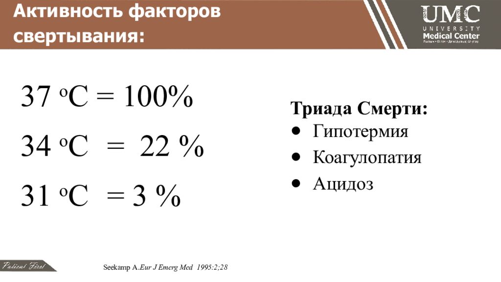 Активность факторов свертывания: Seekamp A. Eur J Emerg Med 1995:2;28 37 о С = 100% 34 о С = 22 % 31 о С = 3 % Триада Смерти: Гипотермия Коагулопатия Ацидоз