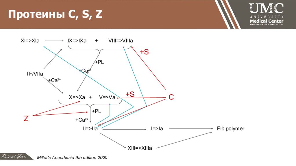 ТF/VIIa IX=>IXa + VIII=>VIIIa +Ca 2+ +Ca 2+ +PL X=>Xa + V=>Va II=>IIa +Ca 2+ +PL I=>Ia Fib polymer C +S +S Z XI=>XIa XIII=>XIIIa Miller's Anesthesia 9th edition 2020