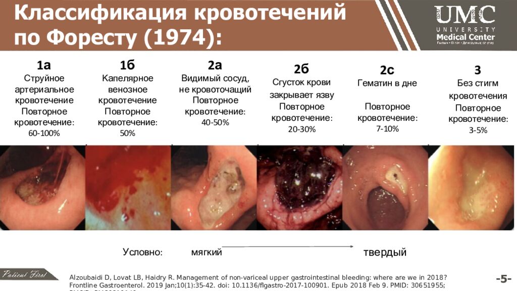- 5- Классификация кровотечений по Форесту (1974): 1 а Струйное артериальное кровотечение Повторное кровотечение : 60-100% 1 б Капелярное венозное кровотечение Повторное кровотечение : 50% 2 а Видимый сосуд, не кровоточащий Повторное кровотечение : 40- 50% 2 б Сгусток крови закрывает язву Повторное кровотечение : 20- 30% 2 с Гематин в дне Повторное кровотечение : 7- 10% 3 Без стигм кровотечения Повторное кровотечение : 3- 5% Условно : мягкий твердый Alzoubaidi D, Lovat LB, Haidry R. Management of non- variceal upper gastrointestinal bleeding: where are we in 2018? Frontline Gastroenterol. 2019 Jan;10(1):35- 42. doi: 10.1136/flgastro- 2017- 100901. Epub 2018 Feb 9. PMID: 30651955; PMCID: PMC6319149.
