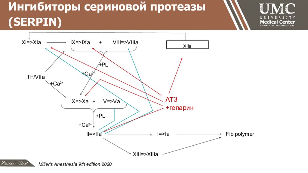 ТF/VIIa IX=>IXa + VIII=>VIIIa +Ca 2+ +Ca 2+ +PL X=>Xa + V=>Va II=>IIa +PL +Ca 2+ I=>Ia Fib polymer AT3 +гепарин XIIa XI=>XIa XIII=>XIIIa Miller's Anesthesia 9th edition 2020