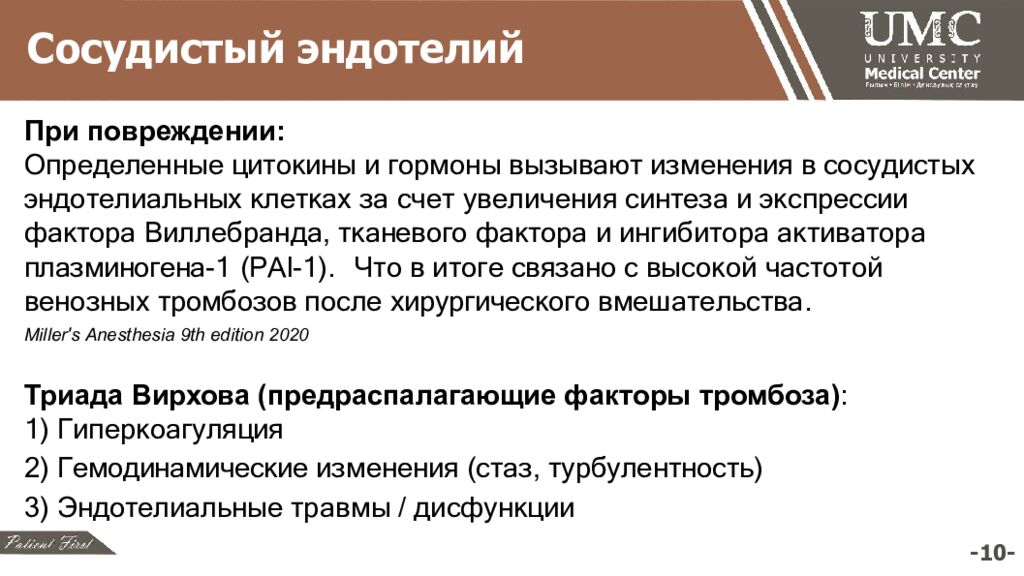 При повреждении: Определенные цитокины и гормоны вызывают изменения в сосудистых эндотелиальных клетках за счет увеличения синтеза и экспрессии фактора Виллебранда, тканевого фактора и ингибитора активатора плазминогена- 1 (PAI- 1). Что в итоге связано с высокой частотой венозных тромбозов после хирургического вмешательства. Miller's Anesthesia 9th edition 2020 Триада Вирхова (предраспалагающие факторы тромбоза) : Гиперкоагуляция Гемодинамические изменения (стаз, турбулентность) Эндотелиальные травмы / дисфункции - 10-
