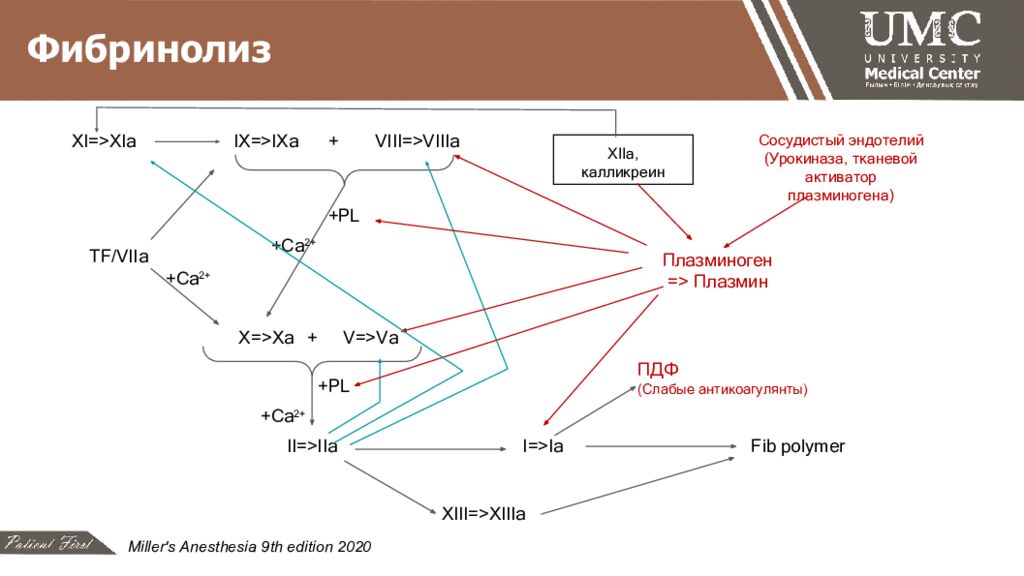 ТF/VIIa IX=>IXa + VIII=>VIIIa +Ca 2+ +Ca 2+ +PL X=>Xa + V=>Va II=>IIa +Ca 2+ +PL I=>Ia Fib polymer Плазминоген => Плазмин Сосудистый эндотелий (Урокиназа, тканевой активатор плазминогена) XIIa, калликреин ПДФ (Слабые антикоагулянты) XI=>XIa XIII=>XIIIa Miller's Anesthesia 9th edition 2020