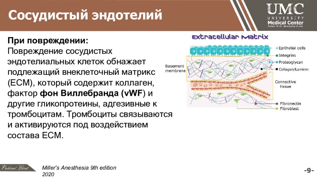 При повреждении: Повреждение сосудистых эндотелиальных клеток обнажает подлежащий внеклеточный матрикс (ECM), который содержит коллаген, фактор фон Виллебранда (vWF ) и другие гликопротеины, адгезивные к тромбоцитам. Тромбоциты связываются и активируются под воздействием состава ECM. Miller's Anesthesia 9th edition 2020 - 7 -