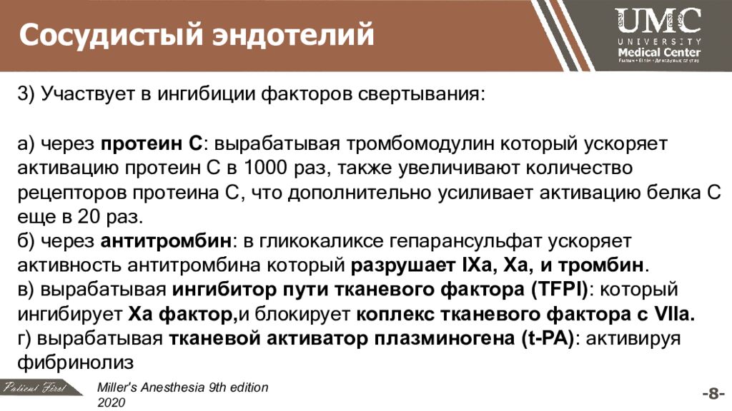 Miller's Anesthesia 9th edition 2020 - 7 - 3) Участвует в ингибиции факторов свертывания: а) через протеин С : вырабатывая тромбомодулин который ускоряет активацию протеин С в 1000 раз, также увеличивают количество рецепторов протеина С, что дополнительно усиливает активацию белка С еще в 20 раз. б) через антитромбин : в гликокаликсе гепарансульфат ускоряет активность антитромбина который разрушает IXa, Xa, и тромбин. в) вырабатывая ингибитор пути тканевого фактора (TFPI) : который ингибирует Xa фактор, и блокирует коплекс тканевого фактора с VIIa. г) вырабатывая тканевой активатор плазминогена (t- PA) : активируя фибринолиз