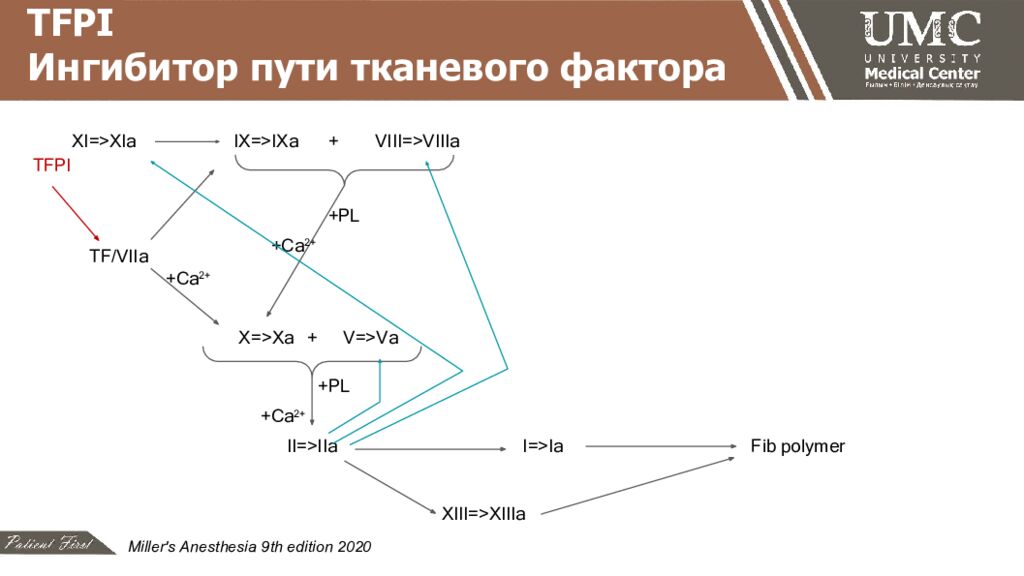 ТF/VIIa IX=>IXa + VIII=>VIIIa +Ca 2+ +Ca 2+ +PL X=>Xa + V=>Va II=>IIa +PL +Ca 2+ I=>Ia Fib polymer XIII=>XIIIa Miller's Anesthesia 9th edition 2020 XI=>XIa TFPI