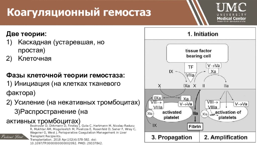 Две теории: Каскадная (устаревшая, но простая) Клеточная Фазы клеточной теории гемостаза: Инициация (на клетках тканевого фактора) Усиление (на некативных тромбоцитах) Распространение (на активных тромбоцитах) Bezinover D, Dirkmann D, Findlay J, Guta C, Hartmann M, Nicolau- Raducu R, Mukhtar AM, Moguilevitch M, Pivalizza E, Rosenfeld D, Saner F, Wray C, Wagener G, West J. Perioperative Coagulation Management in Liver Transplant Recipients. Transplantation. 2018 Apr;102(4):578- 592. doi: 10.1097/TP.0000000000002092. PMID: 29337842.