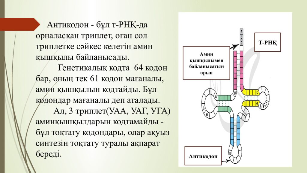 Антикодон - бұл т-РНҚ-да орналасқан триплет, оған сол триплетке сәйкес келетін амин қышқылы байланысады. Генетикалық кодта 64 кодон бар, оның тек 61 кодон мағаналы, амин қышқылын кодтайды. Бұл кодондар мағаналы деп аталады. Ал, 3 триплет (УАА, УАГ, УГА) аминқышқылдарын кодтамайды - бұл тоқтату кодондары, олар ақуыз синтезін тоқтату туралы ақпарат береді. Т-РНҚ Антикодон Амин қышқылымен байланысатын орын