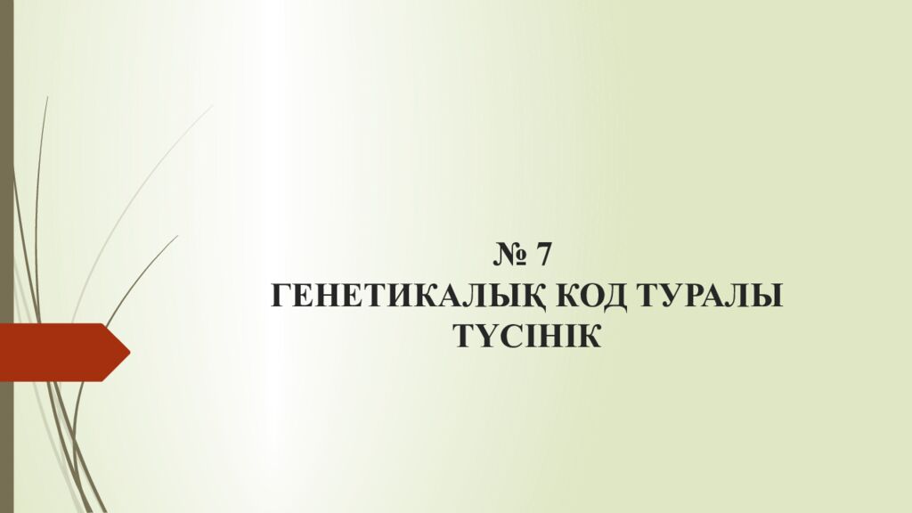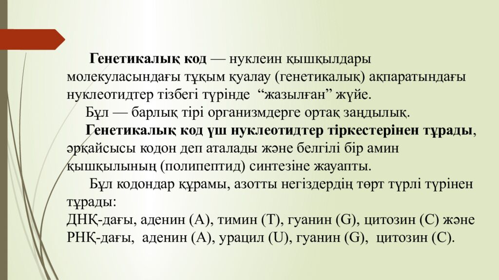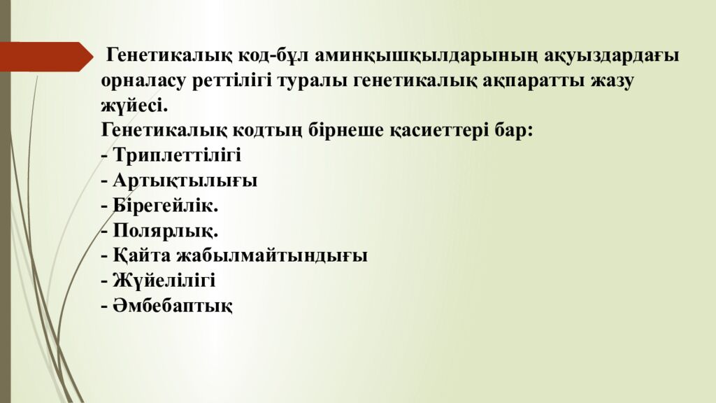 Генетикалық код-бұл аминқышқылдарының ақуыздардағы орналасу реттілігі туралы генетикалық ақпаратты жазу жүйесі. Генетикалық кодтың бірнеше қасиеттері бар: - Триплеттілігі - Артықтылығы - Бірегейлік. - Полярлық. - Қайта жабылмайтындығы - Жүйелілігі - Әмбебаптық