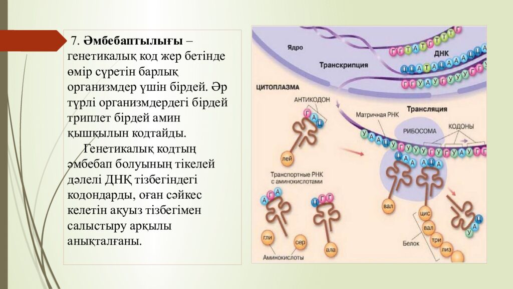 7. Әмбебаптылығы – генетикалық код жер бетінде өмір сүретін барлық организмдер үшін бірдей. Әр түрлі организмдердегі бірдей триплет бірдей амин қышқылын кодтайды. Генетикалық кодтың әмбебап болуының тікелей дәлелі ДНҚ тізбегіндегі кодондарды, оған сәйкес келетін ақуыз тізбегімен салыстыру арқылы анықталғаны.