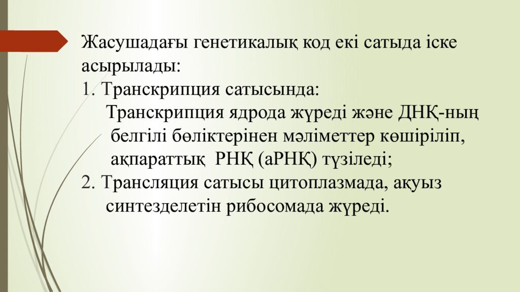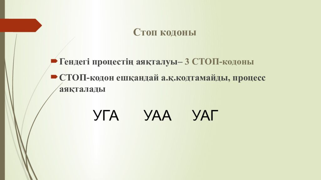 Гендегі процестің аяқталуы – 3 СТОП-кодоны СТОП-кодон ешқандай а.қ.кодтамайды, процесс аяқталады Стоп кодоны УГА УАА УАГ