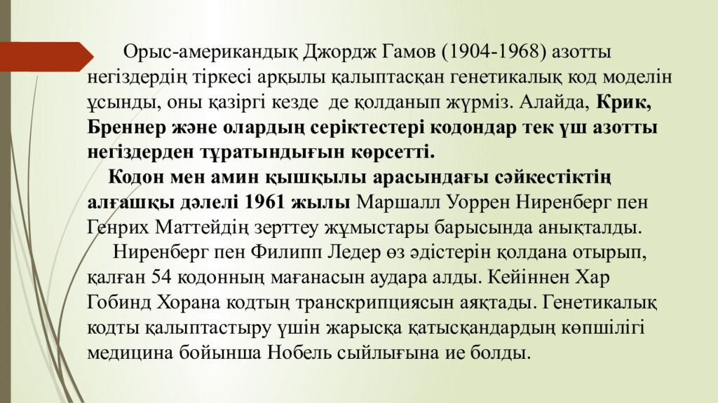 Орыс-американдық Джордж Гамов (1904-1968) азотты негіздердің тіркесі арқылы қалыптасқан генетикалық код моделін ұсынды, оны қазіргі кезде де қолданып жүрміз. Алайда, Крик, Бреннер және олардың серіктестері кодондар тек үш азотты негіздерден тұратындығын көрсетті. Кодон мен амин қышқылы арасындағы сәйкестіктің алғашқы дәлелі 1961 жылы Маршалл Уоррен Ниренберг пен Генрих Маттейдің зерттеу жұмыстары барысында анықталды. Ниренберг пен Филипп Ледер өз әдістерін қолдана отырып, қалған 54 кодонның мағанасын аудара алды. Кейіннен Хар Гобинд Хорана кодтың транскрипциясын аяқтады. Генетикалық кодты қалыптастыру үшін жарысқа қатысқандардың көпшілігі медицина бойынша Нобель сыйлығына ие болды.