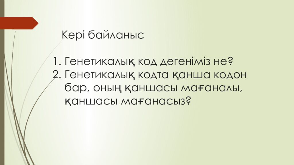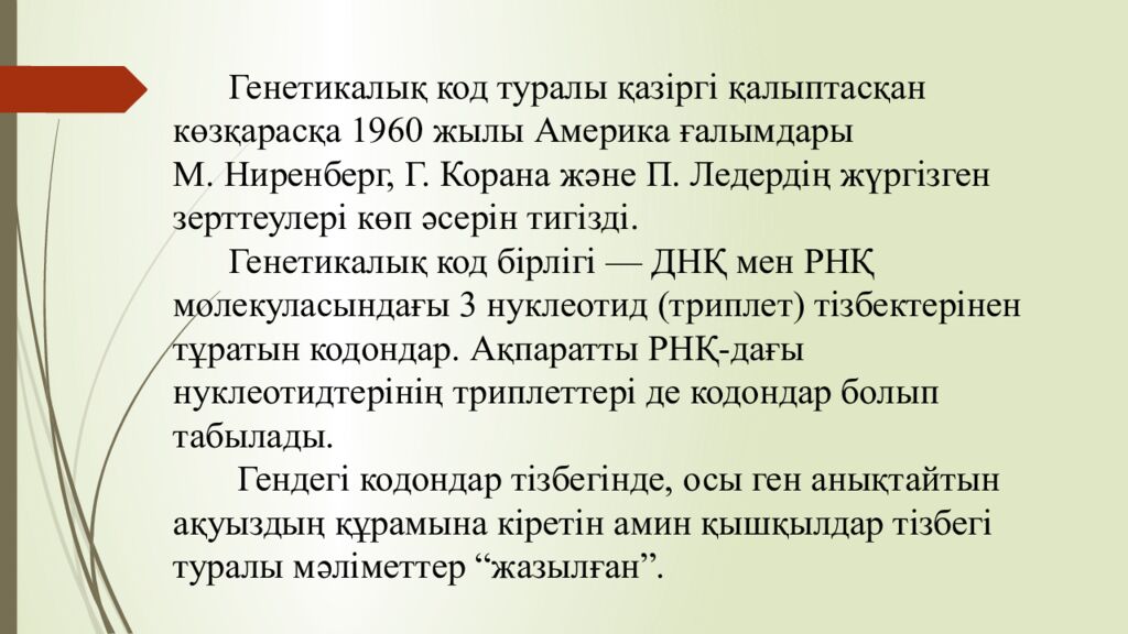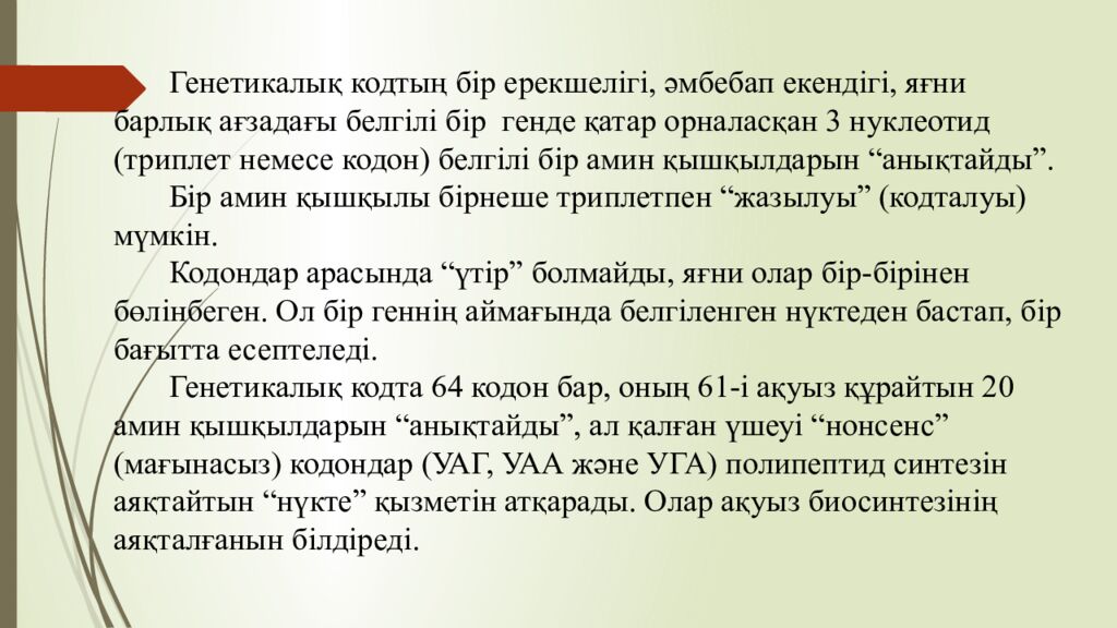 Слайд 20: Генетикалық кодтың бір ерекшелігі, әмбебап екендігі, яғни барлық ағзадағы белгілі бір генде қатар орналасқан 3 нуклеотид (триплет немесе кодон) белгілі бір амин қышқылдарын “ анықтайды ”. Бір амин қышқылы бірнеше триплетпен “ жазылуы ” ( кодталуы ) мүмкін. Кодондар арасында “ үтір ” болмайды, яғни олар бір-бірінен бөлінбеген. Ол бір геннің аймағында белгіленген нүктеден бастап, бір бағытта есептеледі. Генетикалық кодта 64 кодон бар, оның 61-і ақуыз құрайтын 20 амин қышқылдарын “ анықтайды ”, ал қалған үшеуі “нонсенс” ( мағынасыз ) кодондар (УАГ, УАА және УГА) полипептид синтезін аяқтайтын “ нүкте ” қызметін атқарады. Олар ақуыз биосинтезінің аяқталғанын білдіреді