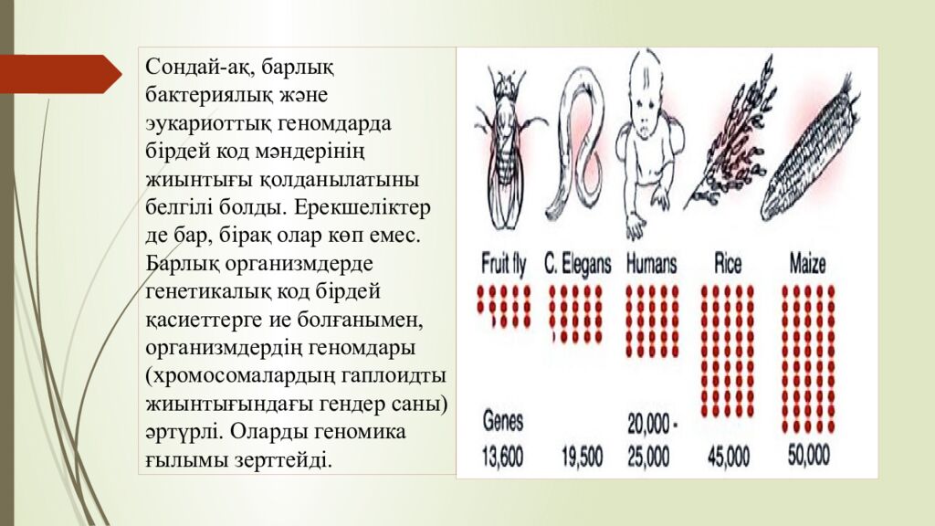Сондай-ақ, ба рлық бактериялық және эукариоттық геномдарда бірдей код мәндерінің жиынтығы қолданылатыны белгілі болды. Ерекшеліктер де бар, бірақ олар көп емес. Барлық организмдерде генетикалық код бірдей қасиеттерге ие болғанымен, организмдердің геномдары (хромосомалардың гаплоидты жиынтығындағы гендер саны) әртүрлі. Оларды геномика ғылымы зерттейді.