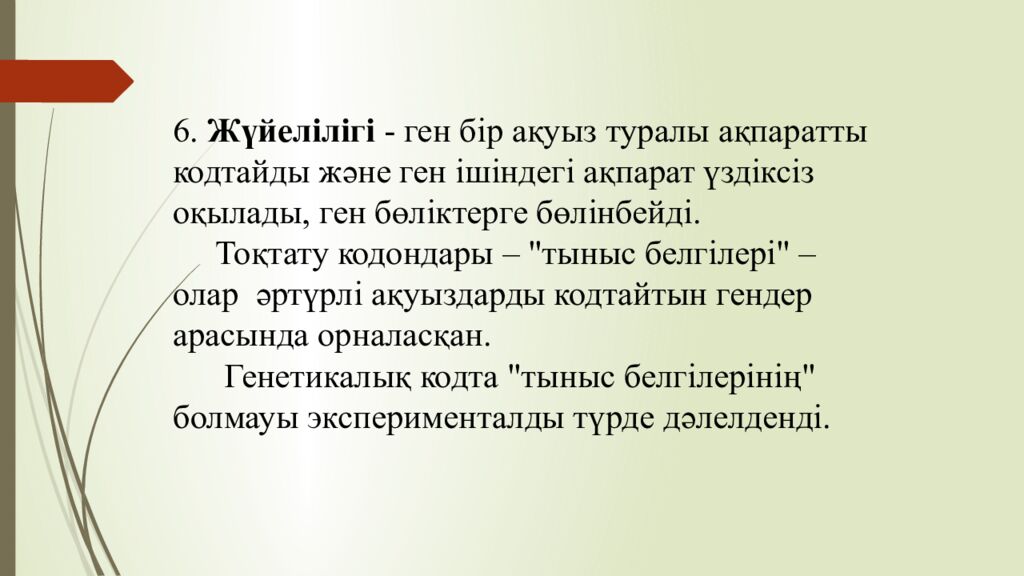 6. Жүйелілігі - ген бір ақуыз туралы ақпаратты кодтайды және ген ішіндегі ақпарат үздіксіз оқылады, ген бөліктерге бөлінбейді. Тоқтату кодондары – "тыныс белгілері" – олар әртүрлі ақуыздарды кодтайтын гендер арасында орналасқан. Генетикалық кодта "тыныс белгілерінің" болмауы эксперименталды түрде дәлелденді.