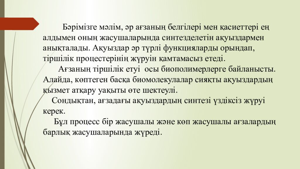 Бәрімізге мәлім, әр ағзаның белгілері мен қасиеттері ең алдымен оның жасушаларында синтезделетін ақуыздармен анықталады. Ақуыздар әр түрлі функцияларды орындап, тіршілік процестерінің жүруін қамтамасыз етеді. Ағзаның тіршілік етуі осы биополимерлерге байланысты. Алайда, көптеген басқа биомолекулалар сияқты ақуыздардың қызмет атқару уақыты өте шектеулі. Сондықтан, ағзадағы ақуыздардың синтезі үздіксіз жүруі керек. Бұл процесс бір жасушалы және көп жасушалы ағзалардың барлық жасушаларында жүреді.