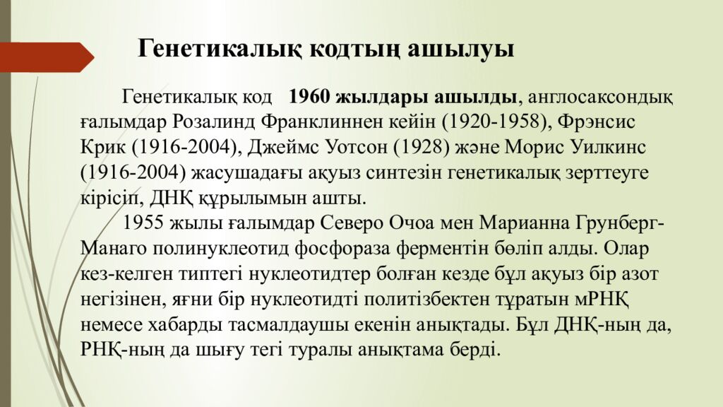 Генетикалық код 1960 жылдары ашылды, англосаксондық ғалымдар Розалинд Франклиннен кейін (1920-1958), Фрэнсис Крик (1916-2004), Джеймс Уотсон (1928) және Морис Уилкинс (1916-2004) жасушадағы ақуыз синтезін генетикалық зерттеуге кірісіп, ДНҚ құрылымын ашты. 1955 жылы ғалымдар Северо Очоа мен Марианна Грунберг-Манаго полинуклеотид фосфораза ферментін бөліп алды. Олар кез-келген типтегі нуклеотидтер болған кезде бұл ақуыз бір азот негізінен, яғни бір нуклеотидті политізбектен тұратын мРНҚ немесе хабарды тасмалдаушы екенін анықтады. Бұл ДНҚ- ның да, РНҚ- ның да шығу тегі туралы анықтама берді.