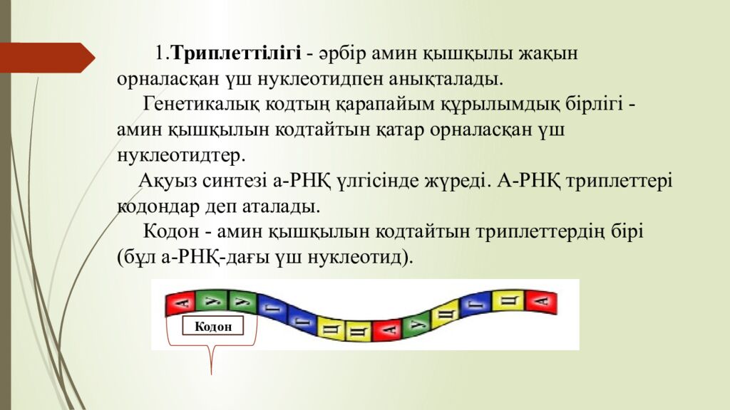 1. Триплеттілігі - әрбір амин қышқылы жақын орналасқан үш нуклеотидпен анықталады. Генетикалық кодтың қарапайым құрылымдық бірлігі -амин қышқылын кодтайтын қатар орналасқан үш нуклеотидтер. Ақуыз синтезі а-РНҚ үлгісінде жүреді. А-РНҚ триплеттері кодондар деп аталады. Кодон - амин қышқылын кодтайтын триплеттердің бірі (бұл а-РНҚ-дағы үш нуклеотид). Кодон
