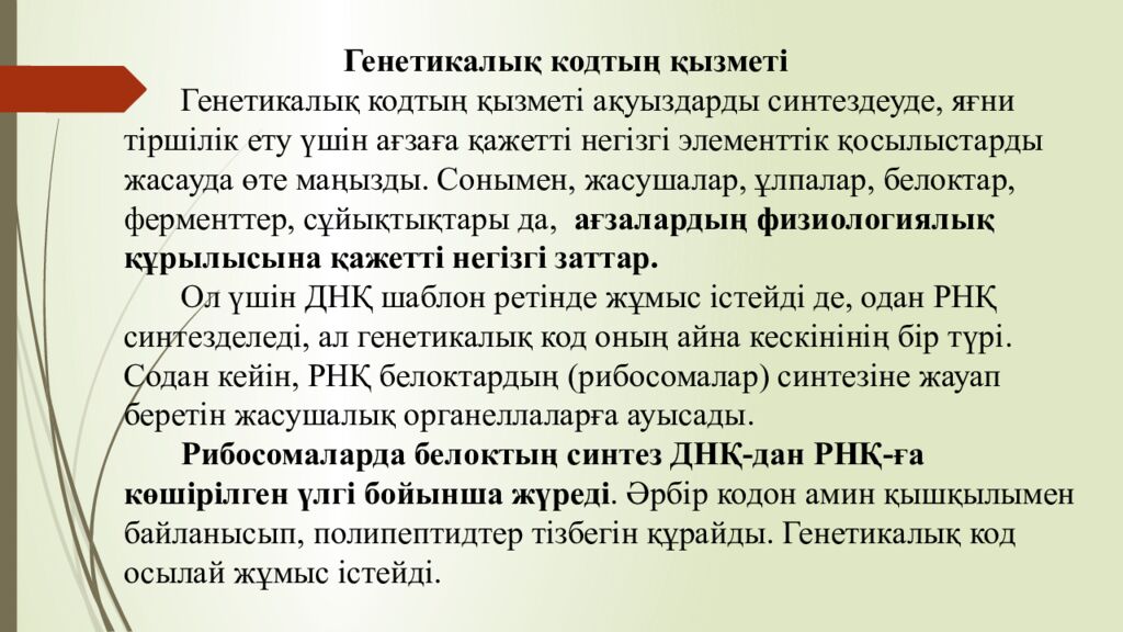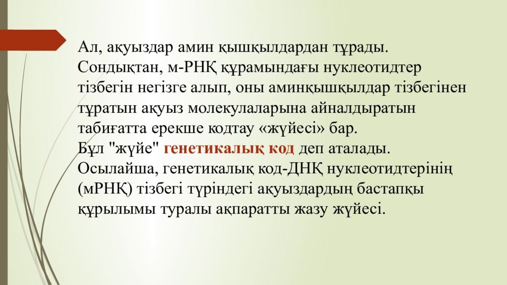 Ал, ақуыздар амин қышқылдардан тұрады. Сондықтан, м-РНҚ құрамындағы нуклеотидтер тізбегін негізге алып, оны аминқышқылдар тізбегінен тұратын ақуыз молекулаларына айналдыратын табиғатта ерекше кодтау « жүйесі » бар. Бұл " жүйе " генетикалық код деп аталады. Осылайша, генетикалық код-ДНҚ нуклеотидтерінің ( мРНҚ ) тізбегі түріндегі ақуыздардың бастапқы құрылымы туралы ақпаратты жазу жүйесі.
