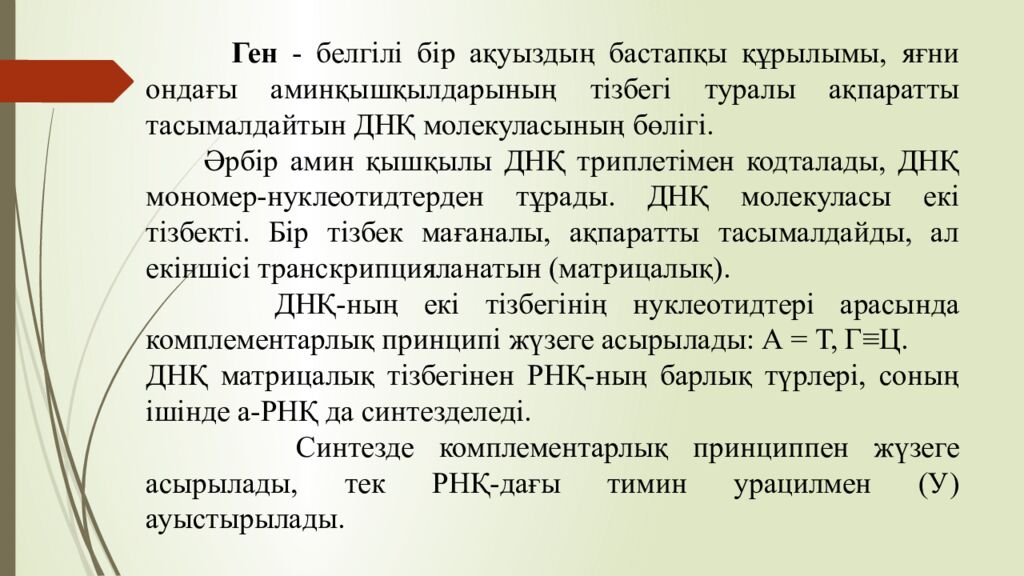 Ген - белгілі бір ақуыздың бастапқы құрылымы, яғни ондағы аминқышқылдарының тізбегі туралы ақпаратты тасымалдайтын ДНҚ молекуласының бөлігі. Әрбір амин қышқылы ДНҚ триплетімен кодталады, ДНҚ мономер-нуклеотидтерден тұрады. ДНҚ молекуласы екі тізбекті. Бір тізбек мағаналы, ақпаратты тасымалдайды, ал екіншісі транскрипцияланатын (матрицалық). ДНҚ-ның екі тізбегінің нуклеотидтері арасында комплементарлық принципі жүзеге асырылады: А = Т, Г≡Ц. ДНҚ матрицалық тізбегінен РНҚ-ның барлық түрлері, соның ішінде а-РНҚ да синтезделеді. Синтезде комплементарлық принциппен жүзеге асырылады, тек РНҚ-дағы тимин урацилмен (У) ауыстырылады.