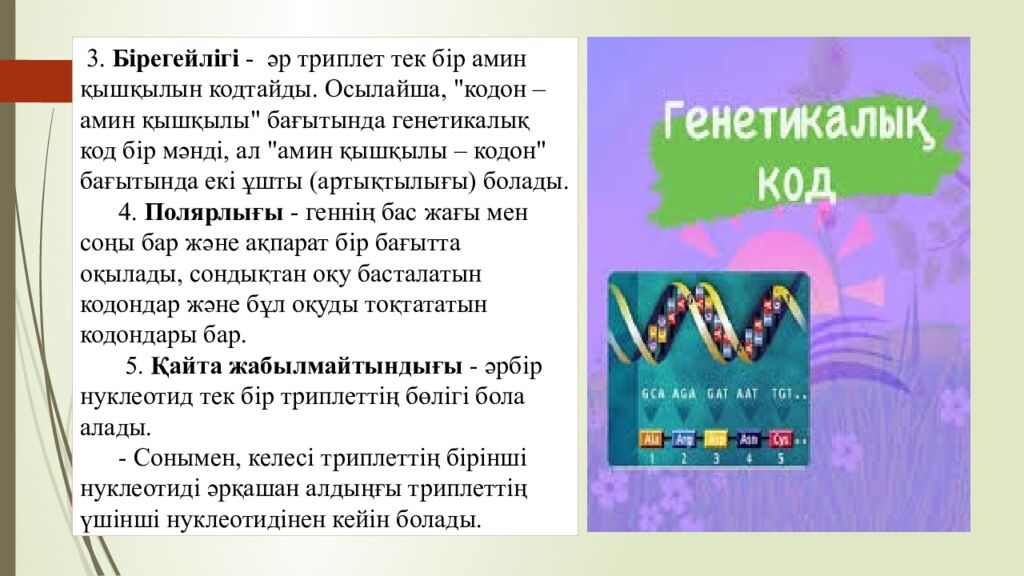 3. Бірегейлігі - әр триплет тек бір амин қышқылын кодтайды. Осылайша, "кодон – амин қышқылы" бағытында генетикалық код бір мәнді, ал "амин қышқылы – кодон" бағытында екі ұшты (артықтылығы) болады. 4. Полярлығы - геннің бас жағы мен соңы бар және ақпарат бір бағытта оқылады, сондықтан оқу басталатын кодондар және бұл оқуды тоқтататын кодондары бар. 5. Қайта жабылмайтындығы - әрбір нуклеотид тек бір триплеттің бөлігі бола алады. - Сонымен, келесі триплеттің бірінші нуклеотиді әрқашан алдыңғы триплеттің үшінші нуклеотидінен кейін болады.