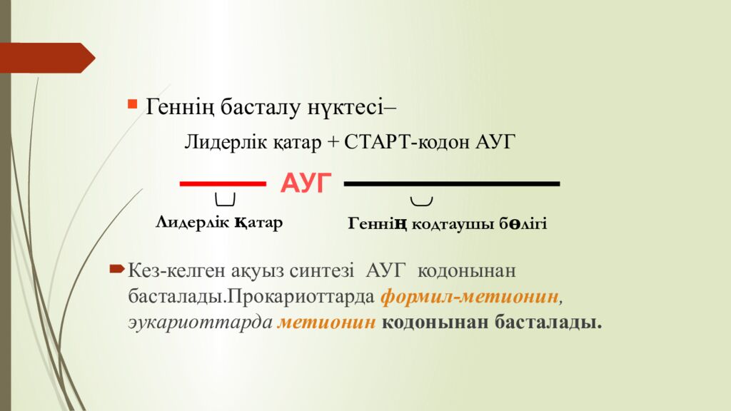 Кез- келген ақуыз синтезі АУГ кодонынан басталады.Прокариоттарда формил -метионин, эукариоттарда метионин кодонынан басталады. Геннің басталу нүктесі – Лидерлік қатар + СТАРТ-кодон АУГ АУГ Лидерлік қатар Геннің кодтаушы бөлігі