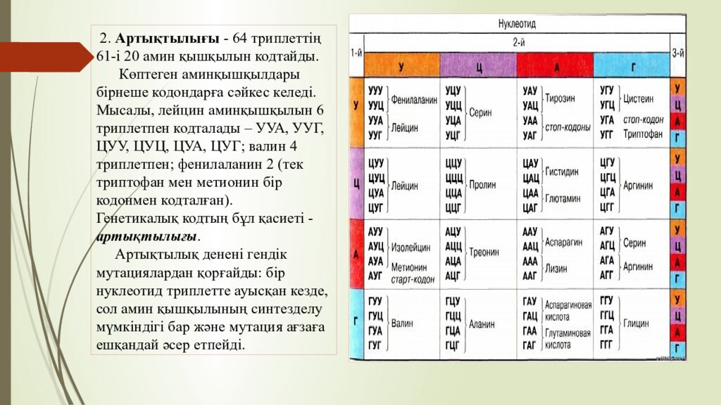 2. Артықтылығы - 64 триплеттің 61-і 20 амин қышқылын кодтайды. Көптеген аминқышқылдары бірнеше кодондарға сәйкес келеді. Мысалы, лейцин аминқышқылын 6 триплетпен кодталады – УУА, УУГ, ЦУУ, ЦУЦ, ЦУА, ЦУГ; валин 4 триплетпен; фенилаланин 2 (тек триптофан мен метионин бір кодонмен кодталған). Генетикалық кодтың бұл қасиеті - артықтылығы. Артықтылық денені гендік мутациялардан қорғайды: бір нуклеотид триплетте ауысқан кезде, сол амин қышқылының синтезделу мүмкіндігі бар және мутация ағзаға ешқандай әсер етпейді.