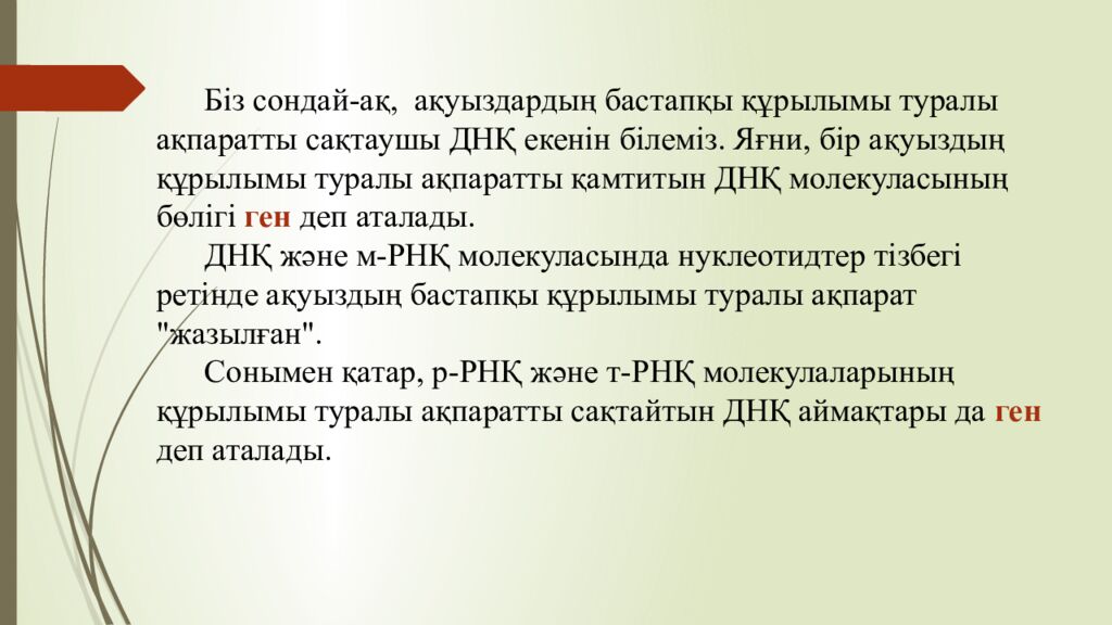 Біз сондай-ақ, ақуыздардың бастапқы құрылымы туралы ақпаратты сақтаушы ДНҚ екенін білеміз. Яғни, бір ақуыздың құрылымы туралы ақпаратты қамтитын ДНҚ молекуласының бөлігі ген деп аталады. ДНҚ және м-РНҚ молекуласында нуклеотидтер тізбегі ретінде ақуыздың бастапқы құрылымы туралы ақпарат " жазылған ". Сонымен қатар, р-РНҚ және т-РНҚ молекулаларының құрылымы туралы ақпаратты сақтайтын ДНҚ аймақтары да ген деп аталады.