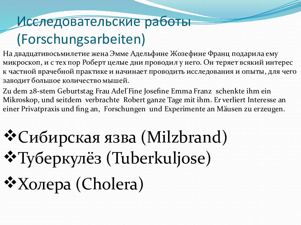 Сибирская язва ( Milzbrand ) Туберкулёз ( Tuberkuljose ) Холера ( Cholera ) Zu dem 28 - stem Geburtstag Frau Adel′Fine Josefine Emma Franz schenkte ihm ein Mikroskop, und seitdem verbrachte Robert ganze Tage mit ihm. Er verliert Interesse an einer Privatpraxis und fing an, Forschungen und Experimente an Mäusen zu erzeugen. На двадцативосьмилетие жена Эмме Адельфине Жозефине Франц подарила ему микроскоп, и с тех пор Роберт целые дни проводил у него. Он теряет всякий интерес к частной врачебной практике и начинает проводить исследования и опыты, для чего заводит большое количество мышей.
