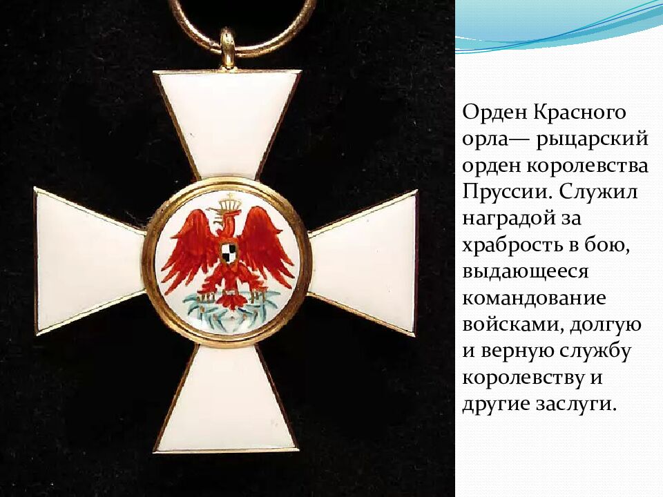 Орден Красного орла— рыцарский орден королевства Пруссии. Служил наградой за храбрость в бою, выдающееся командование войсками, долгую и верную службу королевству и другие заслуги.